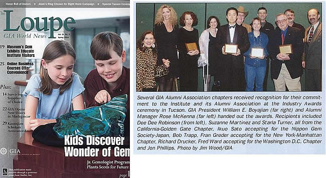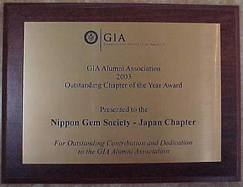 GIA Alumni Association 2003 Outstanding Chapter of the Year Award 受賞 NGSは、より緊密な会員間のコミュニケーションを図ることを目的に、NGSのホームページ(NGS・GIA-CLUB)を立ち上げました。 この活動がこの度、GIAアルミナイ本部から2003年度優秀支部としてアワードを受賞しました。 2004年2月6日 アメリカ・アリゾナ州ツーソンで行なわれた授賞式に、仙台の佐藤郁雄氏が出席し、この栄誉を受けました。